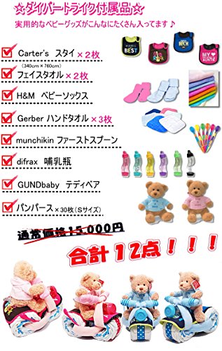 ワンランク上のおむつケーキ新登場!ぬいぐるみはハリウッドセレブにも大人気のガンドベビーのパーカーを着たテディベア。ハンドルのグリップにはH&Mのベビーソックス。ヘットライト部分にはオランダで一番売れているディフラックスの使いやすい新素材哺乳瓶。(パパ、ママ、には授乳時の負担を軽減し、ベビーには母乳を飲むときと同じような安心感、心地よさを実現しました。最先端の安心素材「トライタン」親と赤ちゃんをリラックスさせる哺乳瓶)マフラーはマンチキンの離乳食用ファーストスプーン。前輪のカールとシート部分には大人気のカーターズのかわいいスタイ。ハンドルとタイヤの連結にはふわふわのフェイスタオル。タイヤのホイールにはガーバーの赤ちゃんに優しい肌触りの良いハンドタオル。タイヤはパンパースを使用。 かなりクオリティーの高い出産祝いギフトです。 赤ちゃんにとって実用的なアイテムが全てそろった出産祝いとなっております。 ※撮影時には商品の色をできるだけ忠実に表現できるよう努めておりますが、お使いのモニターの状況などにより、 実際の色とは異なって見えることがございます。 おむつケーキのリボン又、付属品のベビーアイテムは仕入れの状況により色等が変わる場合がございますのでご了承ください。 この商品は衛生上返品、交換を承れません。 ショッピングバック、プレミアムパンパース変更