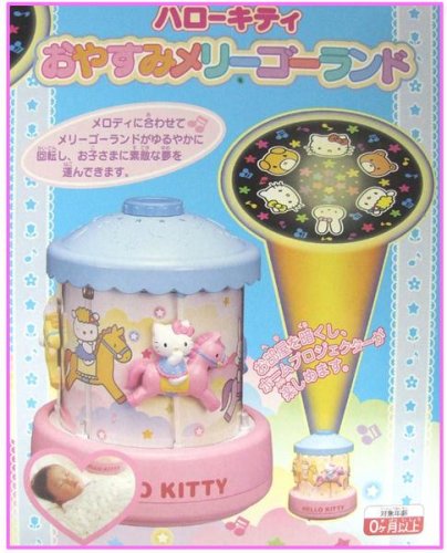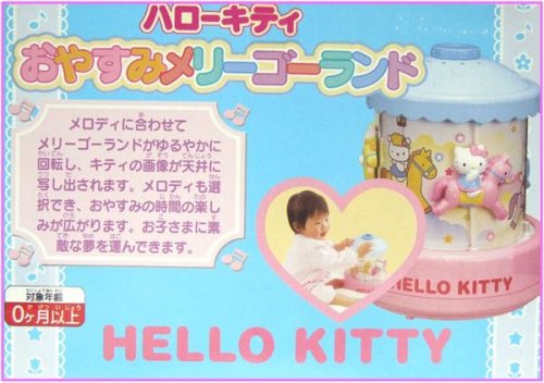 お誕生から使用できるメリーゴーランド。おやすみモードとおひるねモードの2曲のメロディが内蔵されている。おやすみモードは、やさしいメロディと光、回転とともに、天井にキティとお友達が映し出される。おひるねモードはやさしいメロディに合わせてメリーゴーランドが回転する。オートオフ機能付き。