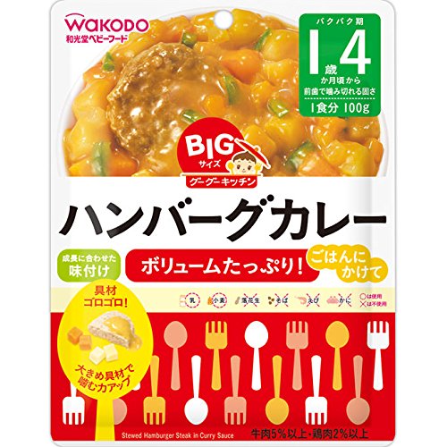 ●【商品説明】●「和光堂 BIGサイズのグーグーキッチン ハンバーグカレー 1歳4か月頃から 100g」は、噛みごたえのある大きめ具材のベビーフードです。●ハンバーグを、辛味成分を使わず仕上げたカレーソースで煮込みました。●パクパク期の1歳4か月頃から。●ボリュームたっぷりのビックサイズ。●着色料、保存料、香料は使用していません。●乳児用規格適用食品。●賞味期限等の表記について西暦年/月/日の順番でパッケージに記載。●【お問い合わせ先】●アサヒグループ食品株式会社 お客様相談室東京都渋谷区恵比寿南2-4-1フリーダイヤル0120-88-9283●【原産国】●日本●【原材料名・栄養成分等】●名称ハンバーグ●原材料名食肉(牛肉、鶏肉)、たまねぎ、大豆たん白、パン粉、食塩、ソース(野菜(にんじん、たまねぎ、かぼちゃ、ピーマン)、じゃがいも、トマトピューレー、小麦粉、バター、全粉乳、野菜エキス、しょうゆ、砂糖、カレー粉、パインアップル果汁、食塩、米酢、植物油脂/増粘剤(加工でん粉))●栄養成分表示/1袋(100g)当りエネルギー:82kcal、たんぱく質:4.3g...