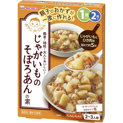 ●【商品説明】●「おやこdeごはん 1歳から 2歳も じゃがいものそぼろあんの素 120g」は、食材を加えるだけで、フライパンひとつで簡単に家族のおかずが作れるじゃがいものそぼろあんの素です。●化学調味料を使わず、かつおだしとほんのりしょうがの風味をいかし、やさしい味に仕上げました。●大人の方もそのままでおいしく召し上がれます。●1歳から。●2-3人前。●にんじん入り。●【お問い合わせ先】●販売元アサヒグループ食品株式会社 お客様相談室東京都渋谷区恵比寿南2-4-1フリーダイヤル0120-889283●【原産国】●日本●【原材料名・栄養成分等】●名称そうざいのもと●原材料名にんじん、砂糖、かつおだし、しょうゆ(小麦・大豆を含む)、食塩、しょうがペースト、米酢/増粘剤(加工でん粉)●栄養成分表示【製品1袋(120g)当たり】エネルギー:64kcal、たんぱく質:1.0g、脂質:0g、炭水化物:14.9g、食塩相当量:3.7g【出来上がり子ども1人前(100g)当たり(※)】エネルギー:100kcal、たんぱく質:4.5g、脂質:3.6g、炭水化物:12.3g、...