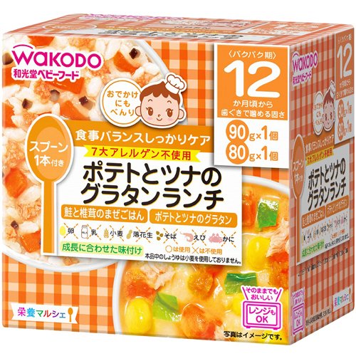 ●【商品説明】●忙しいママの代わりに、バランスのとれた食事をしっかりケアする栄養マルシェ●そのままでもおいしい●調理済みですので、温めずにそのまま召し上がれます。●レンジもOK●主食(ごはん等)が2コ入って、しかもスプーン付●開けてすぐに食べられるから、お出掛けに便利!●12か月頃から●着色料、保存料、香料は使用しておりません。●鮭と椎茸のまぜごはん(90g*1コ入)、ポテトとツナのグラタン(80g*1コ入)が入っています。●まとめ買いの場合、システムの仕様で個数分の送料が加算される場合がありますが、送料は1配送先につき1個分の金額となります。●システムの仕様で配達日を指定出来る場合がありますが、配達日の指定は出来ませんのでご了承ください。尚、時間指定は出来ます。●ご注文確定後のキャンセルならびに、お届けしました商品のお客様都合による「返品 交換」は行っておりません。