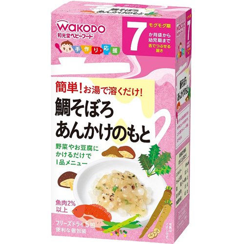 ●【商品説明】●「和光堂 手作り応援 鯛そぼろあんかけのもと 7か月頃から 5包」は、鯛と国産の野菜を使用したあんかけのもとです。●おかゆに混ぜたり、野菜を加えたりと、いろいろなメニュー作りにお使いください。●魚肉2%以上。●便利な個包装タイプ。●7ヶ月頃から幼児期まで。●乳児用規格適用食品。●賞味期限等の表記について西暦年/月/日の順番でパッケージに記載。●【お問い合わせ先】●販売元アサヒグループ食品株式会社 お客様相談室東京都渋谷区恵比寿南2-4-1フリーダイヤル0120-889283●【原産国】●日本●【原材料名・栄養成分等】●名称粉末あんかけ●原材料名でん粉、デキストリン、たいフレーク、和風だし粉末(デキストリン、かつお節エキス、昆布エキス、食塩)、粉末しょうゆ(小麦・大豆を含む)、食塩、ごぼう粉末、フリーズドライ野菜(さやいんげん、ほうれんそう)、しいたけフレーク、酵母エキス、植物油脂●栄養成分表示/製品1包2.7g当たり エネルギー:10kcal、たんぱく質:0.3g、脂質:0-0.06g、炭水化物:2.1g、食塩相当量:0.1g●【保存方法...