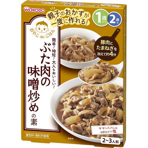 ●【商品説明】●「おやこdeごはん 1歳から 2歳も ぶた肉の味噌炒めの素 120g」は、食材を加えるだけで、フライパンひとつで簡単に家族のおかずが作れるぶた肉の味噌炒めの素です。●化学調味料を使わず、お子さまにも食べやすいごはんがすすむ味噌味に仕上げました。●大人の方もそのままでおいしく召し上がれます。●1歳から。●2-3人前。●【原材料に含まれるアレルギー物質】●小麦・ごま・大豆・鶏肉●【お召し上がり方】●【お子さまには】・・・食べる目安量は100g(出来上がりの1/5)です。●豚肉、玉ねぎを食べやすくほぐしながらあげてください。●目安は1cm程度です。●【大人には】・・・塩を加えると、一層おいしくなります。●■材料(2-3人前)豚肩ロース(薄切り):約300g、たまねぎ1/2個(約100g)、サラダ油:大さじ1/2(約6g)、本品:1袋■下準備 豚肩ロース:3-4cmの一口大に切る。●たまねぎ:幅1-2cmのくし切りにし、さらに半分の長さに切る。●ラップをして電子レンジで500W・2分30秒(600W・2分)加熱する。●■作り方(1)油を熱したフラ...