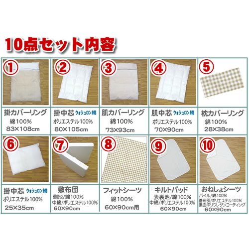 ●セット内容: 1.掛カバーリング 83×108cm 2.掛中芯(ウォッシュロン)80×105cm 3. 肌カバーリング 73×93cm 4. 肌中芯(ウォッシュロン)70×90cm 5. 枕カバーリング 28×38cm 6.枕中芯(ウォッシュロン) 25×35cm 7.敷布団 60×90cm 8.フィットシーツ 60×90cm 9.おねしょシーツ 60×90cm 10.キルトパット 60×90cm ※敷マットはご家庭でお洗濯はできません が側生地は外して洗えます。 ●素材: 中綿/ウォッシュロン綿100% 敷き布団中綿/ポリエステル100%(固綿仕様) 側地/綿100% ●生産国:中国製