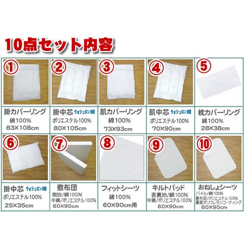 ●セット内容: 1.掛カバーリング 83×108cm 2.掛中芯(ウォッシュロン)80×105cm 3. 肌カバーリング 73×93cm 4. 肌中芯(ウォッシュロン)70×90cm 5. 枕カバーリング 28×38cm 6.枕中芯(ウォッシュロン) 25×35cm 7.敷布団 60×90cm 8.フィットシーツ 60×90cm 9.おねしょシーツ 60×90cm 10.キルトパット 60×90cm ※敷マットはご家庭でお洗濯はできません が側生地は外して洗えます。 ●素材: 中綿/ウォッシュロン綿100% 敷き布団中綿/ポリエステル100%(固綿仕様) 側地/綿100% ●生産国:中国製