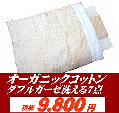 無農薬天然のオーガニックコットンのダブル ガーゼ地を使用。洗う毎に柔らかな風合い が出てまいります。 セット内容 1.掛カバーリング(オーガニックWガーゼ) 約102×128cm 側生地:綿100% 2.掛布団ヌード(テイジンウォッシャブル綿使用) 約95×120cm 側生地:ポリエステル100% 3.掛布団ヌード(テイジンウォッシャブル綿使用) 約95×120cm 側生地:ポリエステル100% 4.枕カバーリング(オーガニックコットン100%) 約33×19cm 側生地:綿100% 5.枕ヌード(テイジンウォッシャブル綿使用) 約33×19cm 側生地:ポリエステル100% 6.敷布団(2つ折タイプ・固綿タイプ) 厚み:約6cm 約70×120cm 7.敷きフィットシーツ(オーガニックコットン100%) 約70×120cm 企画販売:アジル お洗濯方法 オーガニックコットンは普通に洗濯機で洗えます が、漂白の為の塩素系漂白剤や合成洗剤や 柔軟剤はご使用しないで植物性洗剤(エコ洗剤 をおすすめ致します。 ※ヌード掛・枕はお洗濯後は十分 な乾かしをお願い致します。 ご注意 表面の黒い粒は綿花の葉や茎の破片です。 天然100%の為、化学処理を行っておりま せん証です。