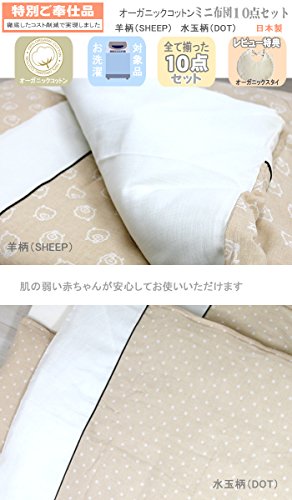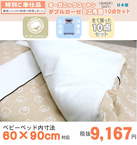 日本製 ベビー布団 オーガニックコットン Wガーゼ 洗えるミニ布団 10点セット 羊柄 (SHEEP) 赤ちゃん用 布団セット ミニサイズ ベッド内寸60cm×90cm対応