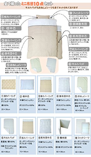 - セット内容(サイズ・素材は商品説明欄にてご確認ください) 1. 掛カバーリング(オーガニックWガーゼ) 2. 掛布団中芯(ウォッシャブル中綿使用) 3. 肌カバーリング(オーガニックWガーゼ) 4. 肌布団中芯(ウォッシャブル中綿使用) 5. 枕カバーリング(オーガニックコットン100%) 6. 枕中芯(ウォッシャブル中綿使用) 7. 敷布団(2つ折タイプ・固綿タイプ) 8. 敷きフィットシーツ(オーガニックコットン100%) 9. キルトパッド 10. おねしょシーツ