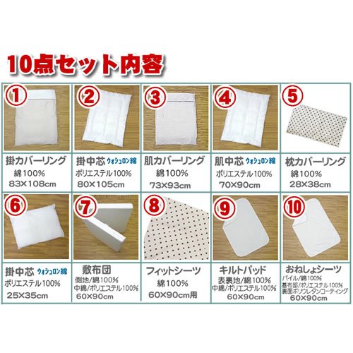 ●セット内容: 1.掛カバーリング 83×108cm 2.掛中芯(ウォッシュロン)80×105cm 3. 肌カバーリング 73×93cm 4. 肌中芯(ウォッシュロン)70×90cm 5. 枕カバーリング 28×38cm 6.枕中芯(ウォッシュロン) 25×35cm 7.敷布団 60×90cm 8.フィットシーツ 60×90cm 9.おねしょシーツ 60×90cm 10.キルトパット 60×90cm ※敷マットはご家庭でお洗濯はできません が側生地は外して洗えます。 ●素材: 中綿/ウォッシュロン綿100% 敷き布団中綿/ポリエステル100%(固綿仕様) 側地/綿100% ●生産国:中国製