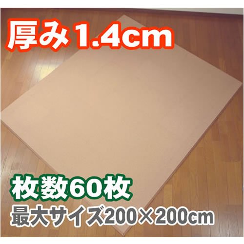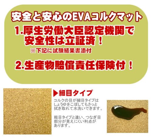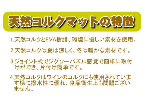 ●カラー:ナチュラル ● セット内容: 正方形マット:36枚(30×30×1.4cm) エッジマット:16枚(30×9×1.4cm) 角マット:8枚(35×9×1.4cm) 合計60枚 ●素材:マット/EVA樹脂 表面/天然コルク 手提げ袋/PEVE樹脂 【ご注意】 ※他社製品とはジョイント(組み合わ せ)できません。 ※追加で拡張する場合、2011年8月以前に ご購入の同商品「厚み1.4cmコルクマット」と は組み合わせができません。 ※開封時に加工時のにおいが感じら れますが、害はございません。 使用段階で臭いは消えてまいります。 ※天然木のため、マットは「水洗い」 はできません。 汚れの場合は、水絞った布で拭く取 りしてください。 家庭用洗剤等は使用しないでください。 ※お子様の飲み物・排尿がマット下に 浸み込んだ場合は早めの拭取りとマッ トの表裏を完全に乾かしてからご使用 ください。 ※特殊な仕様のフローリング床(例: 大理石風白床)はご使用しないでく ださい。 ※フローリングのワックス後は1週間 程(十分に乾いた後)経ってからご使 用ください。 ※冬期の結露でマットが濡れた場合 は拭取り後、乾かしてからご使用く ださい。 ※表面に1mm程の穴が見受けられ事 がございます。一般販売のEVAマット は滑りがあります。弊社のマットはこの 滑りを無くした為の極小の加工穴とな ります。