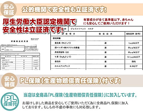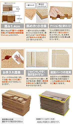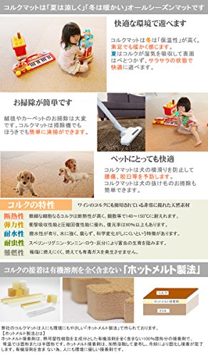 - 特徴:1. 厚さ1.4cmで衝撃や音を吸収。階下への防音対策・防音効果にもなります。2. 角・エッジマットは斜めにカットされているので、つまづきを防止します。よちよち歩きの赤ちゃんや老人、介護の方も安心してご使用いただけます。3. 自由に組み合わせができるので、お部屋の大きさに合わせてご使用ください。4. 天然コルクと環境にやさしいEVAでお子様にも安心。5. 天然コルクは夏は涼しく冬はあたたか♪肌ざわりもサラサラ♪年中快適にご使用いただけます。6. 保温効果(床暖房の熱は伝わりません)があります。7. 床の傷つきを防ぎます。ペットによるフローリングのキズ防止にもなります。8. 「抗菌加工」が菌の付着を防ぎます。9. お掃除、お手入れも簡単♪