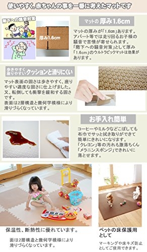 - 「歩きやすく」「座りやすい」にこだわった適度な固さに仕上がっており、厚み1.6cmで、転倒時の衝撃の緩和や階下への音の響きの軽減(防音対策)にも効果的です。アパートやマンションで走り回るお子様の足音による苦情対策(騒音対策)としても人気のあるクッション性抜群のパズルマットです。また、マットの表面は「2層構造」と「幾何学模様」により滑りにくくなっています。保温性、断熱性にも優れています。
