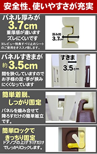 組み立てについて:パネルを噛み合わせて降ろすだけの簡単組立でしっかり固定できます。簡単に開閉できるドアノブ付き!ドアノブの上げ下げだけでしっかりロックできるので、ママも安心、使い勝手も抜群です。