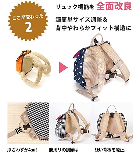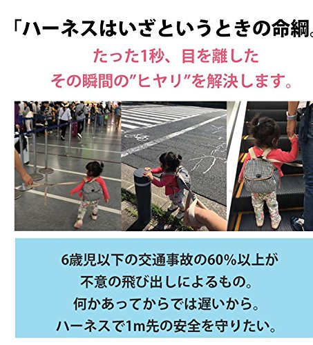 - 可愛いリュックにハーネス・リードが付いて、子供の不意な飛び出しから安全を守ります。