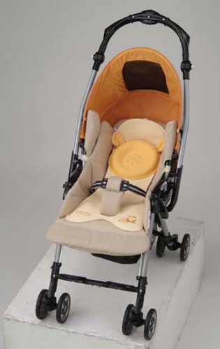 ベビープーのイラスト入りベビーカー用シート(クッション)。ベビーカーに取り付けるだけでムレを防ぎ、赤ちゃんが快適に過ごすことができる。頭をのせるキャラパッド(気道閉塞マモールパッド)が、やさしく頭部を支える。A型ベビーカーに対応。