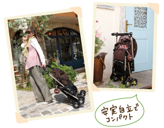 ![]() | 抱っこしてもラクラク ワンタッチ開閉+安定自立設計 赤ちゃんを抱っこしたまま片手で転がせる。片手でコンパクトに折り畳め、そのまま置ける安定自立設計。収納や待ち運びに便利