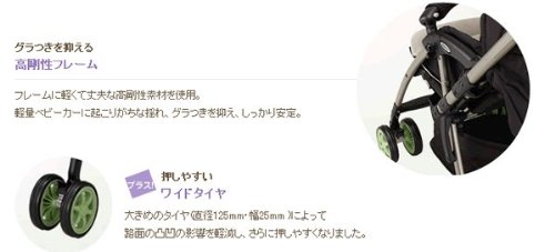車体のグラつきを軽減し、サスペンション効果を発揮。「高剛性フレーム」軽量で剛性の高いアルミフレーム同士を溶接することで、高剛性と軽量を両立。軽量ベビーカーにありがちなグラつきも抑える。剛性が高いことで、サスペンションが効果的に働く構造を実現。