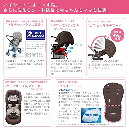 ●製品特徴:押しやすく、持ちやすい。ベビーカーの決定版!ハイシート&オート4輪で軽量5.4kg!さらに洗える取り外し簡単シート搭載。人気の機能充実で赤ちゃんもママも快適。●開閉サイズ:W45×D82.5~91×H98.5~99.5cm、収納時:W45×D34×H98cm●重量:5.4kg●対象年齢:生後1~36ヶ月●制限体重:15kg以下●リクライニングの角度:120~170度
