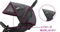 ![]() | セパレート幌(エキストラシェード付) 前後の幌がカンタンに取り外せるから、成長に合わせて4タイプの形状変化が可能。エキストラシェード(日よけ)付きで、日ざしが強い日も安心。使わないときはスッキリとした幌でお出かけできる。 ※正面・サイド・背面と風通しを良くし、押しながら赤ちゃんの様子がわかるメッシュウインドウ。 |