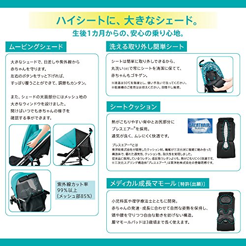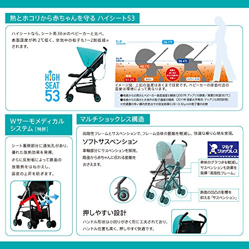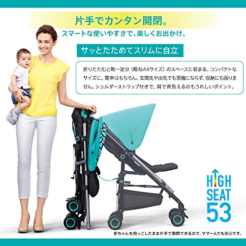 ●フルリクライニング(170度)で生後1か月の赤ちゃんから使用可能。●折りたたむと靴一足分(概ねA4サイズ)のスペースに収まる、コンパクトなサイズに。電車はもちろん、玄関先や出先でも邪魔にならず、収納にも困りません。ショルダーストラップ付きで、肩で背負えるのもうれしいポイント。サッとたためてスリムに自立。●大きなムービングシェードで、日差しや紫外線から赤ちゃんを守ります。左右のボタンをサッと下げれば、すっぽり覆うことができて、調節もカンタン。また、シェードの天面部分にはメッシュ地の大きなウィンドウを設けました。開けばいつでも赤ちゃんの様子がいつでも確認する事ができます。●シートが簡単に取り外しできるから、常にシートを清潔に保てて、赤ちゃんもゴキゲン。●熱がこもりやすい背中とお尻部分にブレスエアーRを採用。通気が良く、ムレにくく快適です。●小児科医や理学療法士とともに開発したメディカル成長マモール。赤ちゃんの発達・成長に合わせて自然な姿勢を保持し、頭や腰を守りつつ自由な動きを妨げない構造。腰マモールパッドは3歳頃まで長く使えます。●ハイシート53なら、シート高38㎝のベビーカ...