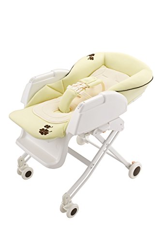 - 一台で、食事、寝かしつけ、あやし機能を持った、室内移動可能のハイローベッド&チェアです。