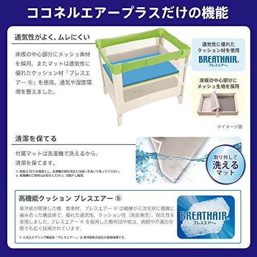 ●製品特徴:人気のねむれる・たためる・運べるベビーベッド「ココネル」に、赤ちゃんの睡眠環境をもっと整えるために、通気とムレに強い機能と、取り外して洗えるマットを付属した新モデル。●ベッドサイズ:W104.1×D73.7×H94cm、袋収納時:W29×D27×H94cm、内寸W60×90cm●重量:16kg●対象年齢:新生児~24ヶ月【上段-新生児(体重2.5kg)~つかまり立ちが出来る(概ね生後5カ月以上)まで・下段-つかまり立ちが出来る頃(概ね生後5カ月以上)~24カ月まで 】●素材:フレーム-スチール・ポリプロピレン・ABS樹脂・ポリアミド、縫製品-ポリエステル、床板-MDF(中質繊維板)、付属マット-ブレスエアー・ポリエステル