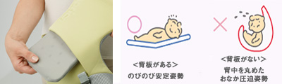 ヨコ抱っこ時の姿勢(平らなベッド状態)を安定させる背板。ヨコ抱っこ時を過ぎると取り出せ、赤ちゃんの成長段階に合わせた抱き方ができる。