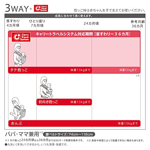 - ※使用期間について。キャリートラベルシステム対応期間[首すわり~36ヵ月]。タテ抱っこ[首すわり4ヵ月頃~24ヵ月(体重13kg)]。前向き抱っこ[ひとり座り7ヵ月頃~24ヵ月頃(体重13kg)]。おんぶ[首すわり4ヵ月頃~36ヵ月頃(体重15㎏)]
