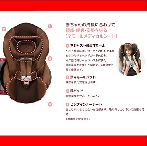 | 赤ちゃんの成長に合わせて 頭部・呼吸・姿勢を守る 「マモールメディカルシート」 1アジャスト成長マモール ベッド型の時は、頭・首への揺れや衝撃をやわらげるヘッドガードの役割。 イス型の時はヘッドレストに変化。側面衝突を考慮した設計で、4歳頃まで長く使えます。 2頭マモールパッド 頭部を支え安定させます。 3腰パッド おなかの圧迫を防ぎ、腹式呼吸を妨げません。 4ヒップインナーシート おしりや太もものムレを防ぎます。取り外しカンタンで洗濯も可能。 4歳頃まで使えます。 |