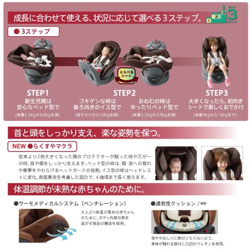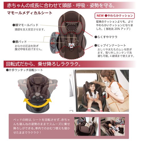 ●製品特徴:車の中でもまっすぐに寝かせてあげられる「平らなベッド」になる回転式チャイルドシート。赤ちゃんの首に負担をかけず、腹式呼吸を妨げない、安心の設計です。従来より2倍大きくなった頭のプロテクター「らくすやマクラ」が、眠った時などに、首や頭をしっかり支えます。●ベッド時:W79×D59.3×H56.6cm、起立時:W47×D59.3?69×H56.6?67cm●重量:13.8kg●対象年齢:0~4歳●制限体重:2.5~18kg迄