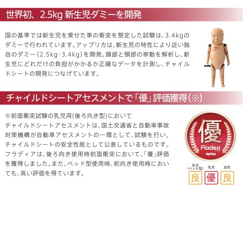 - チャイルドシートアセスメント前面衝突試験の乳幼児(後ろ向き型)回転ベッド型で「優」取得