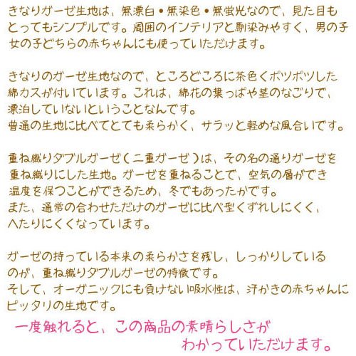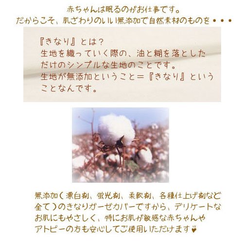- [本体サイズ] 掛布団中芯:W125×D100×H3cm、掛布団カバーリング(きなりガーゼ):W130×H105cm、枕中芯:W33×D23cm、敷布団(手押し洗い可):W120×D70×H7cm、敷布団用フィットシーツ(きなりガーゼ):W120×D70cm