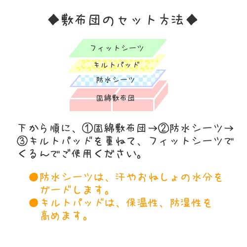 アトリエいつきが材料から縫製、仕上げまで愛知県内で手配、生産しております。 【タイプ】丸洗いOK カバーリング二枚合わせ【メーカー】アトリエいつき 【セット内容】掛布団中芯(厚手):95×120×約4cm、掛布団中芯(薄手):95×120×約3cm、掛布団カバーリング(水玉)103×130cm、固綿敷布団(折りたたみタイプ・手押し洗い可:70×120×5cm、枕中芯:23×33×3cm、枕カバー(水玉):25×35cm、フィットシーツ:70×120cm 【素材】表地:綿100%、布団側地:無蛍光・オフ白ブロード、中綿:ポリエステル(ウォシュロン)100%