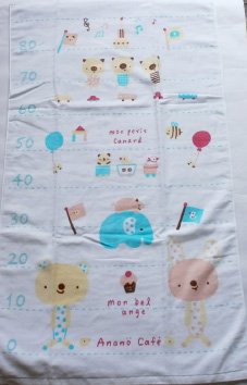 何枚あっても重宝するのがバスタオル。赤ちゃんは本当に毎日沢山のタオルを使いますね 薄手で取り扱いが簡単で、滑らか加工をした柔らかなバスタオルはいかかでしょうか?。 通気性と吸湿性に優れ、お洗濯にも強く乾きが早いすごいバスタオルです お風呂のタオルに湯上りタオルに、おくるみアフガンにお昼寝の時の掛け物に、バギーの掛け物にとご用途はいっぱい。 可愛い柄のプリントに加えて、目盛りがプリントされていますので、身長計としても使えます。 赤ちゃんをくるむ度に身長が測れ、日々の成長が実感できる感動商品です。80cmまで測れます。 サイズ=60cmx100cmサイズです。 日本製が嬉しいベビー用品です。