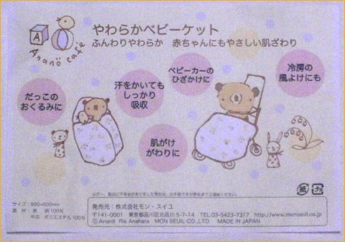アナノカフェの可愛いガーゼ製のマルチケットです。 タオルケットとして、肌掛けとして、アフガンおくるみとして、ひざ掛けとして、夏の冷房対策として色んな使い方ができます。 素材も肉厚ガーゼの中に薄いポリエステル綿を入れて、更に細かくキルティングしている高級素材です。 とっても肌触りがよくて吸湿性にも富んだまさに至れりつくせりのマルチケットです。 大切な赤ちゃんにはやっぱり良い物を与えてあげたいですね。 柄も可愛いアナノワールドのキャラクターがいっぱい。 こんな便利で幸せがいっぱい詰まったマルチケットはいかがでしょうか? 贈るかたのセンスがしのばれる逸品です。 大きさも使い勝手のいい90cmx60cmが嬉しい。
