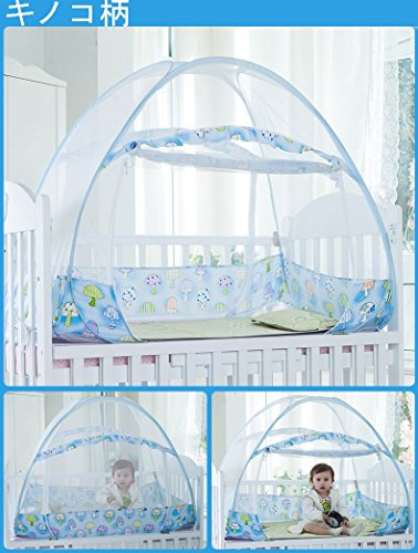蚊帳 ベビー 赤ちゃん ワンタッチ式蚊帳 ムカデ対策 簡単設置 簡単収納 子供用ワンタッチ蚊帳 キッズ コンパクト/収納 折りたたみ (160*88*100cm, キノコ柄-ブルー)
