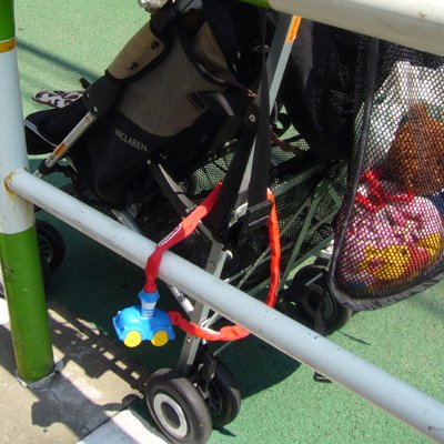 ベビーカーの盗難防止に最適なベビーカー専用ロックです。ベビーカーにマッチングするデザインで布製の保護カバーで覆われたチェーン製ケーブルによりベビーカーや固定対象箇所の傷つきを防ぎます。ベビーカーを卒業したら三輪車や自転車などにも使用できます。