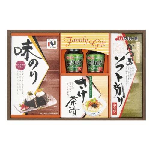 ニコニコ味のり(8切8枚2袋)・さけ茶漬け(6g×4袋)・マルトモかつおソフト削り(1.5g×6袋)各1箱・磯じまんのり佃煮75g×2瓶・賞味期間/製造日より常温約360日・[日本製]・【乳・小麦・えび・さけ・さば・大豆・豚肉・ゼラチン】
