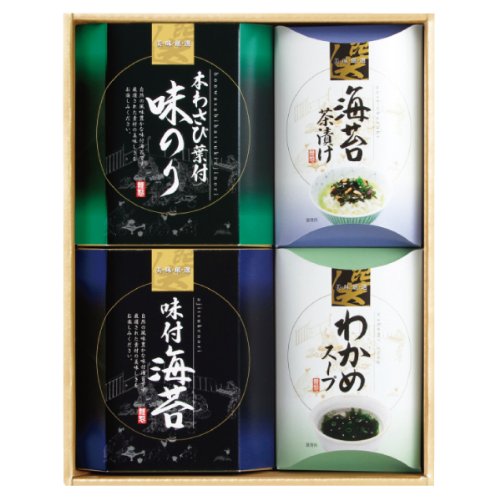 有明産味付海苔(8切8枚2袋)・わさび味付海苔(8切8枚2袋)・海苔茶漬(5g×4袋)・わかめスープ(3.5g×4袋)各1箱・賞味期間/製造日より常温約360日・[日本製]・【乳・小麦・えび・大豆・鶏肉】
