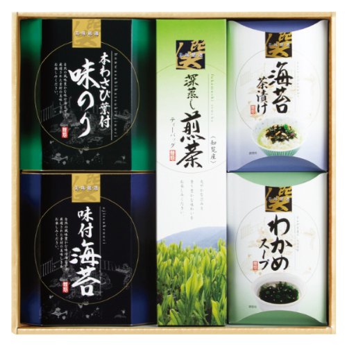有明産味付海苔(8切8枚2袋)・わさび味付海苔(8切8枚2袋)・海苔茶漬(5g×4袋)・わかめスープ(3.5g×4袋)・知覧深蒸し煎茶ティーバッグ(2g×5袋)各1箱・賞味期間/製造日より常温約360日・[日本製]・【乳・小麦・えび・大豆・鶏肉】