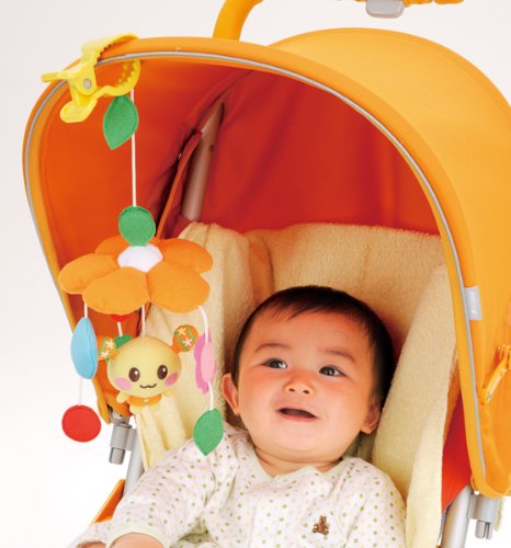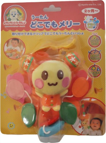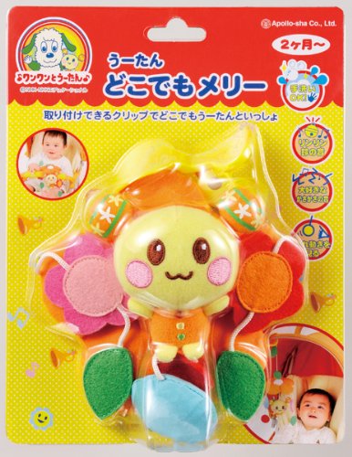 「う-たんどこでもメリー 2ヶ月から」は、取り付けできるクリップでどこでも遊べるメリーです。ふわふわやさしい手触りなので、手に持って遊んでも安心。水玉には赤ちゃんの好きなかさかさの音。フェルトのお花や葉っぱはつまんだり毛先の訓練。大きめのクリップはベビーカーのフードやバーの部分、ベビーベッドやチャイルドシートなど、いろいろな所に取り付けられます。面ファスナー付きで取り外しが簡単。フェルトのお花や葉っぱはつまんだり手先の訓練に。うーたんはりんりん鈴の音でやさしく赤ちゃんを見守ります。