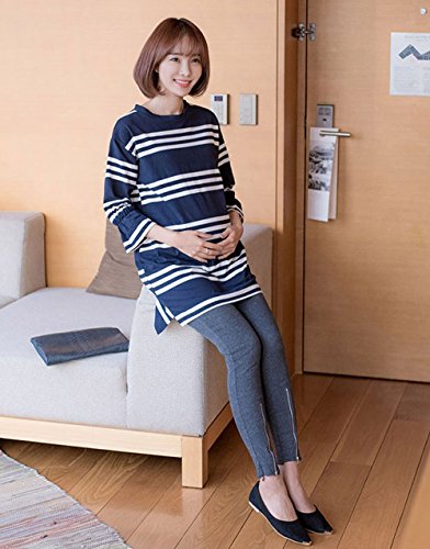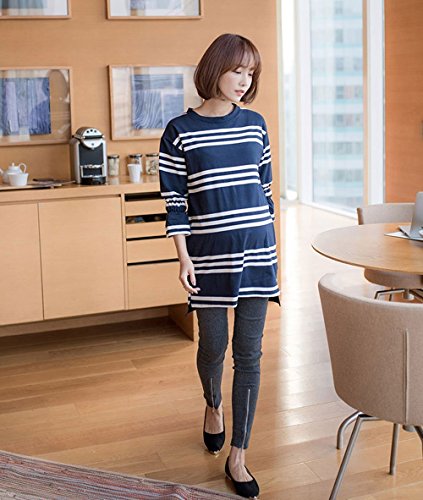 【MIKA&MAYA】 マタニティ Tシャツ チュニック ボーダー 7分袖 フレア シャツ ロンT (フリーサイズ, ネイビー)