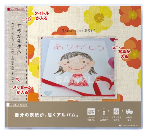 表紙はオーダーメイド。「ありがとう」、「おめでとう」を写真と一緒に贈るアルバム。【特長】・写真と言葉で大切な人に想いを伝えたい。 メッセージカードとアルバムという機能を兼ね備えた全く新しいアルバム、 それがオリジナル表紙のジャケットアルバムです。・アルバムを購入し、携帯、パソコンで写真とメッセージを送ると表紙が印刷されて届きます。 中は貼ってはがせて、写真が映える黒台紙。・表紙のデザインは全部で10種類。お好きなデザインのアルバムをお求めください。【使用方法】(1)まとめたい写真、贈りたい相手に合わせて表紙をオリジナルにできます。 タイトルやメッセージなどもオリジナルに。 本体を購入し、携帯やパソコンから写真等を送信するだけ。 約1週間で表紙が届きます。(2)ベビー、ブライダル、仲間、旅行など、それぞれのシーンやターゲットに合うよう 10種類のデザインを用意。(3)表紙と中身を作って贈る、表紙だけを作って贈る、購入したまま贈るなど 贈り方も選べるところが魅力。