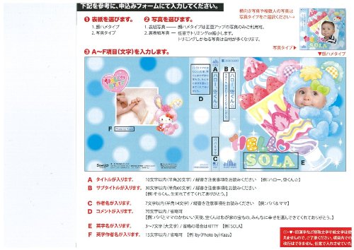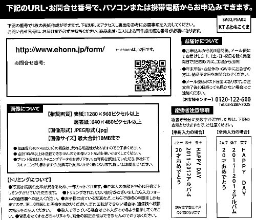 - アルバムの中にあるIDで専用サイトにアクセス。携帯かパソコンからお気に入りの画像とメッセージを送信するだけ。簡単に世界にたった一つのアルバム表紙が作れます。