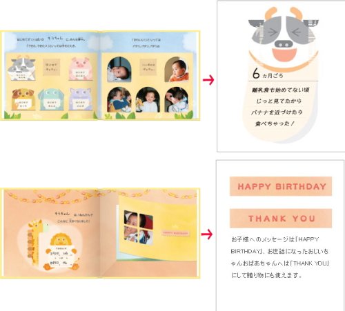 はじめてがいっぱいの1才までの様子を育児日記のように残せます。