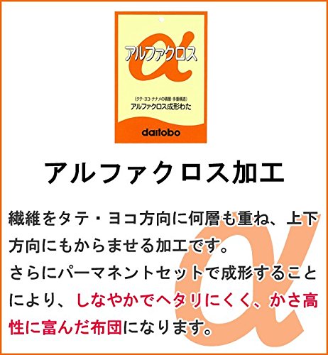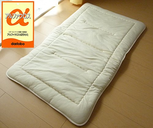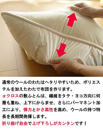 通常のウールわたはへたりやすいため、ポリエステルを加えたわたで布団を作ります。アルファクロスの敷ふとんは、ウール繊維をタテ・ヨコ方向に何層も重ね、上下にからませ、さらにパーマネント加工により、弾力性とかさ高性を高め、ウールの持つ特長を長期間発揮します。折り曲げ自由で上げ下ろしがカンタンです!