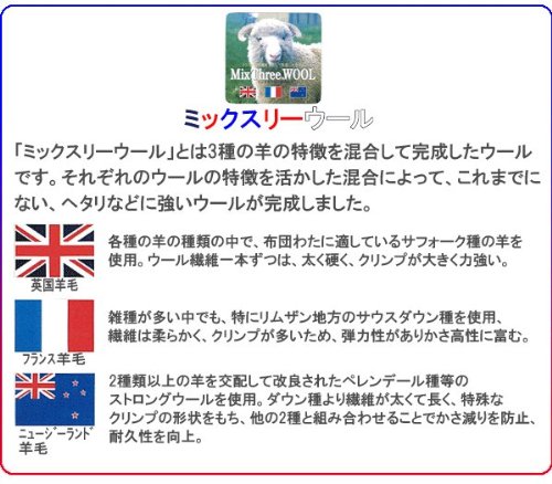 - ミックスリーウール【3種のヒツジの特徴を混合して完成したウールのことです。それぞれのウールの特徴を活かした混合によって、これまでにないへたりなどに強いウールが完成しました!ウール繊維1本ずつ、太く硬く、クリンプが大きく力強い「英国羊毛」。繊維が柔かく、クリンプが多いため、弾力性がありかさ高性に富んだ「フランス羊毛」。ダウン種より繊維が太くて長く、特殊なクリンプの形状を持ち、他の2種と組み合わせることでかさ減りを防止、耐久性を向上させた「ニュージーランド羊毛」】