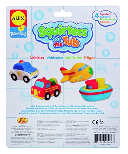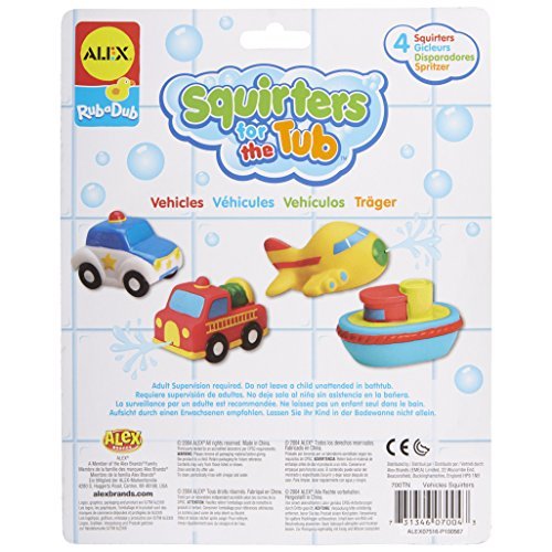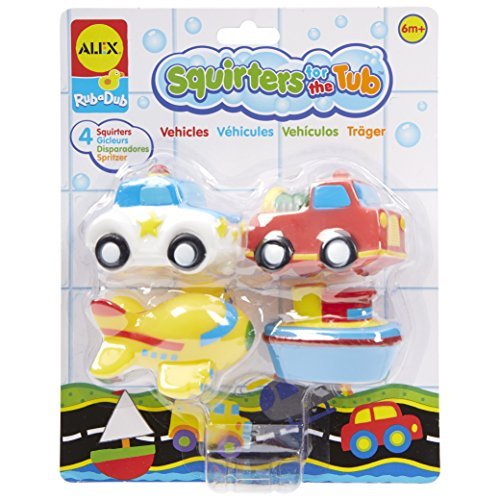 ALEX Toys Rub a Dub Squirters for the Tub ? Vehicles make for a super fun time in the bathtub. 4 colorful 3in. vehicles will let your child travel on land, sea or air and wet anything that gets in their way! Squirters are sized perfectly for small hands and includes a police car, fire truck, airplane and boat. Vehicle squirters are sure to make bath time the most fun time of the day! Recommended for children 6 months of age and older.