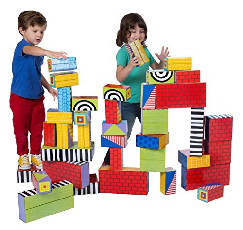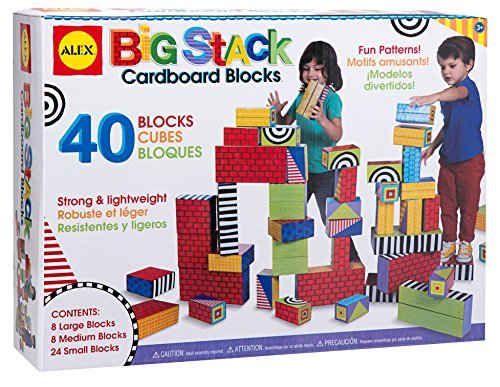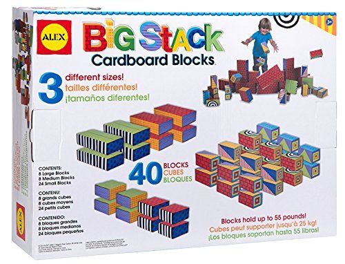 ALEX Toys Big Stack Cardboard Blocks is the perfect toy to build it BIG! Let your child build away with the 40 light-in-weight, yet sturdy blocks included in this set. You can even stand on them; they hold up to 120 pounds. The blocks are printed with different patterns on each side so you can design different looks. This block set includes 24 small (6in. x 3in. x 3in.), 8 medium (6in. x 6in. x3in.) and 8 large (3in. x 6in. x 12in.) cardboard blocks. Adult assembly is required to fold the cardboard into blocks. Recommended for children 3 years of age and older.