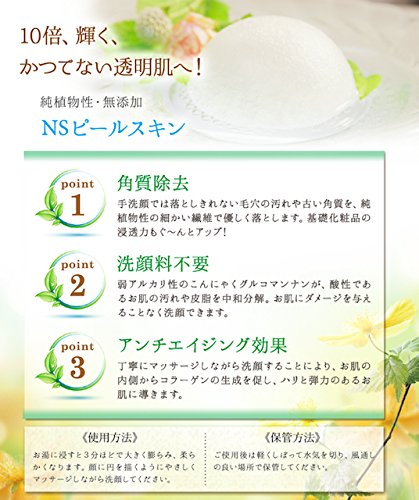 「NSピールスキン」は100%無添加の天然こんにゃくスポンジです。【角質除去】手洗顔では落としきれない毛穴の汚れや古い角質を、純植物性の細かい繊維で優しく落とします。基礎化粧品の浸透力もぐ〜んとアップ!【洗顔料不要】 弱アルカリ性のこんにゃくグルコマンナンが、酸性であるお肌の汚れや皮脂を中和分解。お肌にダメージを与えることなく洗顔できます。【アンチエイジング対策】こんにゃくに含まれる<セラミド成分>がお肌に潤いを与えます。 また、丁寧しマッサージしながら洗顔することにより、お肌の内側からコラーゲンの生成を促し、ハリと弾力のあるお肌に導きます。★無農薬で育ったこんにゃくです海抜1200メートルの高原で、美しい水、土、空気で育ちました。 化学製品は一切使用していません。★品質の良さは肌触りの違い! 徹底した、温度湿度管理の向上で、均一できめ細かな気泡作りに成功しました。ぜひ1度その違いをお試しください。 ★プレゼントに最適 可愛らしいパッケージは、ご友人やご家族へのちょっとした贈り物に大変ご好評いただいております。 炭タイプ(竹炭エキス配合) 炭の力でお肌を活性化し、若々しいハリと弾力のあるお肌へ導きます【コンセプト】 女性は化粧をして美しく見せることに時間をかけますが、 「落とす」ことは忘れがち・・・ 素肌の基本が整っていないと、いくら栄養を与えても 吸収する力が弱く、お肌が疲れてきてしまいます。 毎日のメイク汚れや、古い角質を丁寧に落とすことが大切。 そんな思いからNSピールスキンは、生まれました。